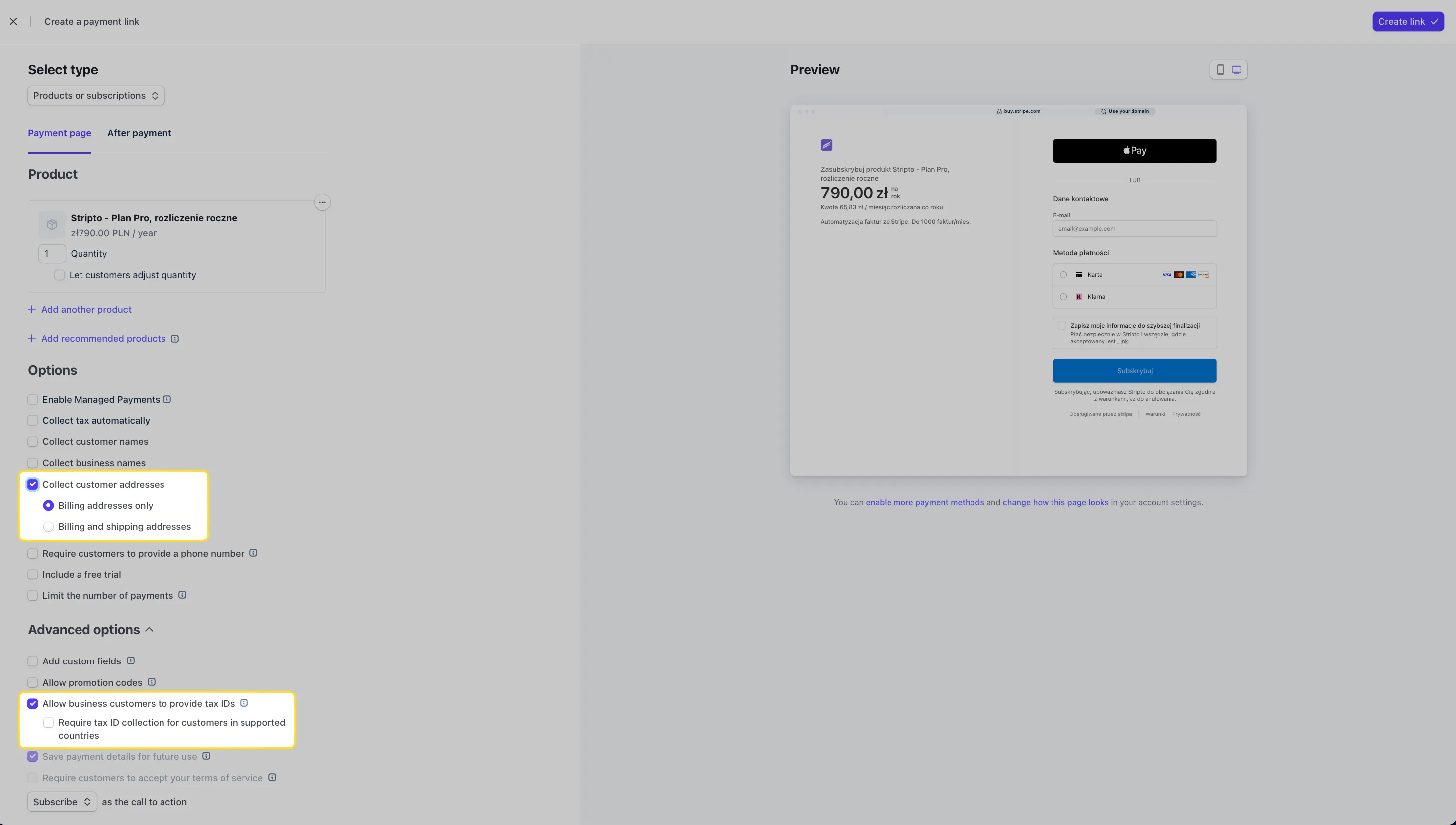 Przy okazji konfiguracji Payment Link warto włączyć zbieranie numerów identyfikacji podatkowej. Dzięki temu klienci firmowi (B2B) będą mogli podać swój NIP podczas płatności, a Stripto automatycznie umieści go na fakturze.